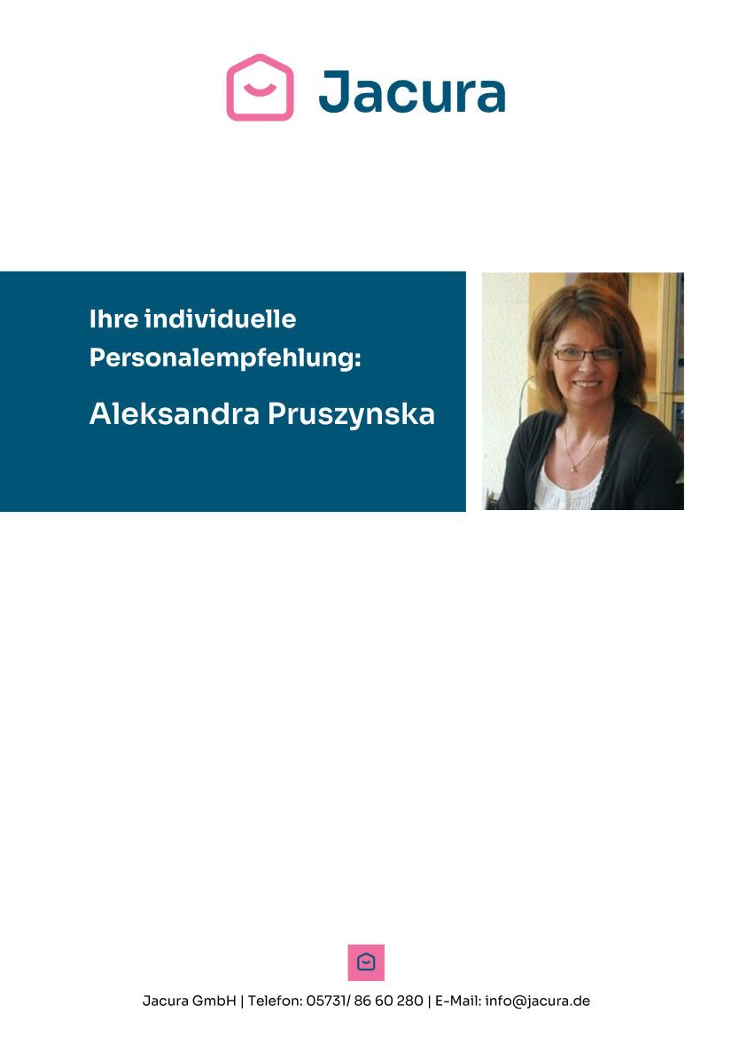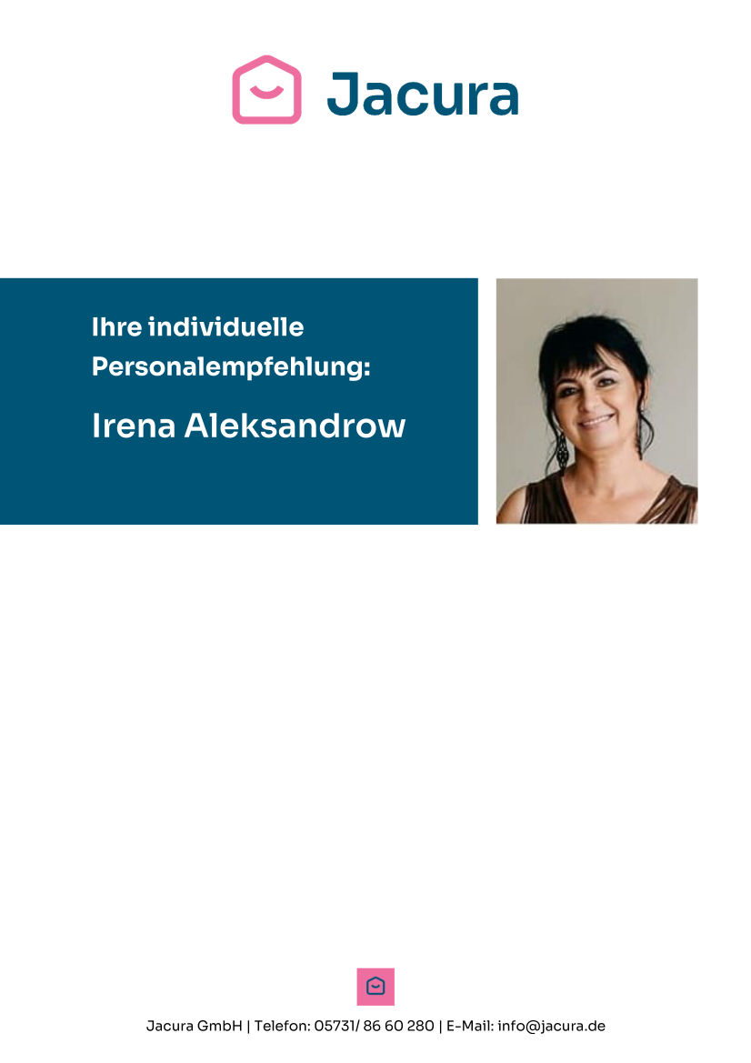 Seit acht Jahren widmet sich Aleksandra mit großer Leidenschaft der Betreuung älterer Menschen. Vier dieser Jahre verbrachte sie im Ausland, wo sie in sechs verschiedenen Haushalten tätig war und wertvolle Erfahrungen sammelte. Ihre einfühlsame Art, gepaart mit ihrer ausgeprägten Zuverlässigkeit, schafft Vertrauen und eine geborgene Atmosphäre.